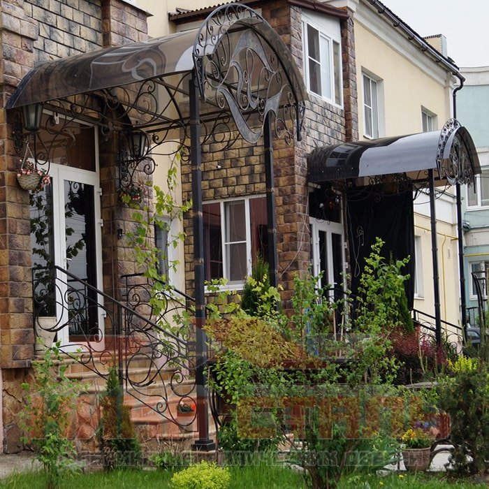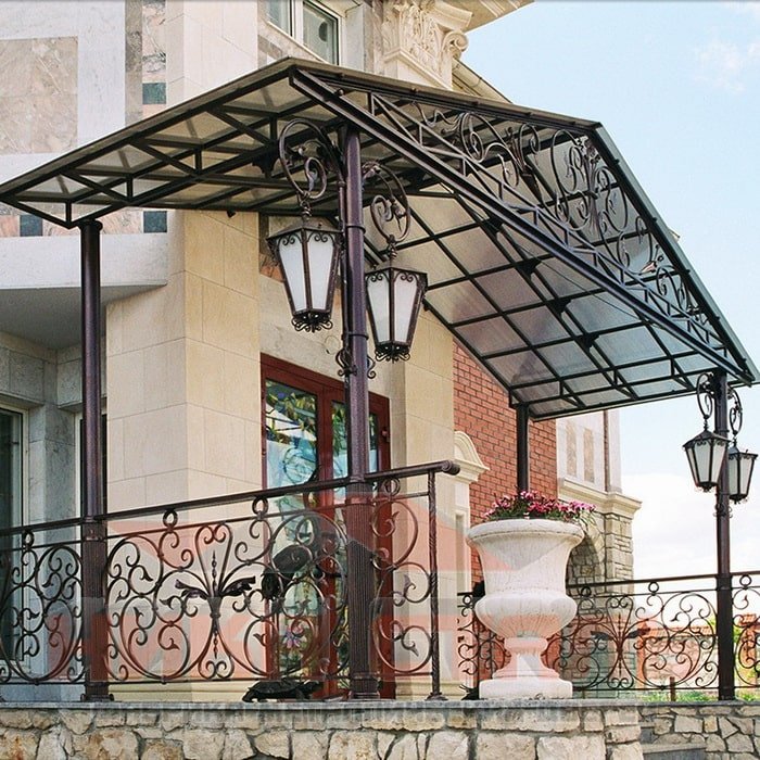 - кованый (от 36 000 руб.). Навес, украшенный изысканными объемными узорами из металла, эффектно украсит парадный вход частного дома, офиса, торгового предприятия и т. п. Опора из кованых элементов отлично сочетается с крышей из стальных листов или поликарбоната. В нашей компании можно купить навес с растительным, абстрактным, геометрическим орнаментом. От сложности узора зависит, сколько стоит готовое изделие.